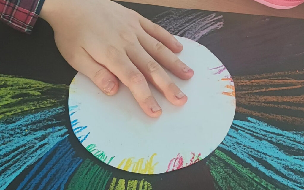 Zaczęliśmy od koła wyciętego z kartki, które posłużyło jako punkt wyjścia dla naszych małych artystów. Dzieci otaczały to koło kolorowymi pastelami, tworząc urokliwą ramkę dookoła. To był moment pełen radości i kreatywności, gdy kolory mieszały się ze sobą, tworząc wyjątkowe kompozycje.