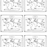 Najprostszy sposób: wydruk strony, dziecko koloruje wybraną mapę kredkami, wycina po obwodzie i wkleja klejem na pierwszą stronę nowego rozdziału. Drugi sposób: wklejenie tej samej mapy kilka razy w różnych miejscach w zeszycie — dziecko za każdym razem zaznacza inny element (kontynent, ocean, miejsce z lekcji o pogodzie, kraj zamieszkania kolegi z klasy). Trzeci wariant — wklejenie pustej mapy bez podpisów i samodzielne dopisywanie angielskich nazw przy okazji każdej lekcji.