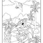 Dinozaury w pełnej scenie — Stegozaur wśród palm, T-Rex w dżungli, Brachiozaur przy wulkanie, dinozaury wykluwające się z jajek. Styl kawaii cartoon z dużymi, przyjaznymi oczami. Pełne strony A4, dziecko koloruje zarówno postać jak i tło.
