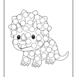 Unikalna aktywność rzadko spotykana w polskich PDF-ach — dinozaur pokryty dużymi kółkami, dziecko zakreśla każde kółko farbką-markerem, naklejką lub kredką. Rozwija motorykę małą, precyzję ręki. Dla 3-5 latków idealne.