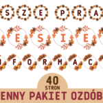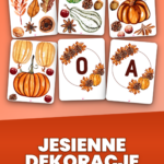 Jesienny pakiet dekoracji nr 2 do sali przedszkolnej i szkolnej. Kolorowe ozdoby z motywami jesieni — liście, grzyby, owoce.