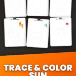 Pobierasz plik PDF, drukujesz wybrane strony na zwykłej kartce A4. Dziecko obrysowuje przerywaną linię ołówkiem lub kredką, a potem koloruje gotowy kształt. Można pracować po jednej stronie dziennie albo zrobić cały zestaw jako tygodniowy projekt o tematyce lato.