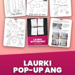 Zestaw czterech kartek pop-up po angielsku do samodzielnego wycięcia, sklejenia i ozdobienia. W środku zestawu cztery różne motywy: tort urodzinowy z napisem Happy Birthday, robot z dymkiem with lots of love, rakieta z hasłem Love you to the moon and back oraz jednorożec z napisem Love You. Każda laurka ma jedną stronę z elementami do wycięcia i drugą stronę z paskami harmonijkowymi (tzw. fold tabs), które po sklejeniu unoszą rysunek nad kartką i tworzą efekt 3D. Materiał jest gotowy do druku w domu na zwykłym papierze A4.