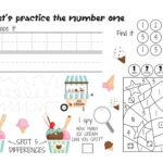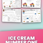 Karty pracy liczby po angielsku karty pracy dla przedszkolaków i pierwszoklasistów. Dziesięć stron A4 landscape, na których dziecko poznaje cyfry od 1 do 10 razem z motywami lodów, samochodów, monster trucks i przedmiotów ze szkolnego plecaka. Wszystkie polecenia są po angielsku (let's practice the number, trace it, write it, find it, before and after, color it), a układ jest tak zaprojektowany, żeby maluch przy każdej cyfrze trenował od razu kilka rzeczy: pisanie po śladzie, rozpoznawanie cyfry w grupie, odwzorowanie na ten-frame, kolorowanie według kodu i prostą gimnastykę uważności.
