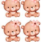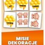 Wytnij litery banera i ułóż napis „NASZE URODZINY" nad tablicą korkową. Pod spodem powieś 12 etykiet z miesiącami w kolejności kalendarzowej. Do każdego miesiąca przypnij figurki misiów z imionami dzieci, które obchodzą wtedy urodziny — wystarczy podpisać imię cienkopisem na białym brzuszku misia albo na osobnej karteczce dopiętej obok.
