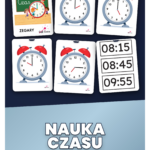 Najpierw dziecko opanowuje godziny po polsku, potem te same karty w wersji ANG. Half past four obok wpół do piątej, quarter to nine obok za piętnaście dziewiąta. Nauka czasu i języka w jednym, klasa 2-3.