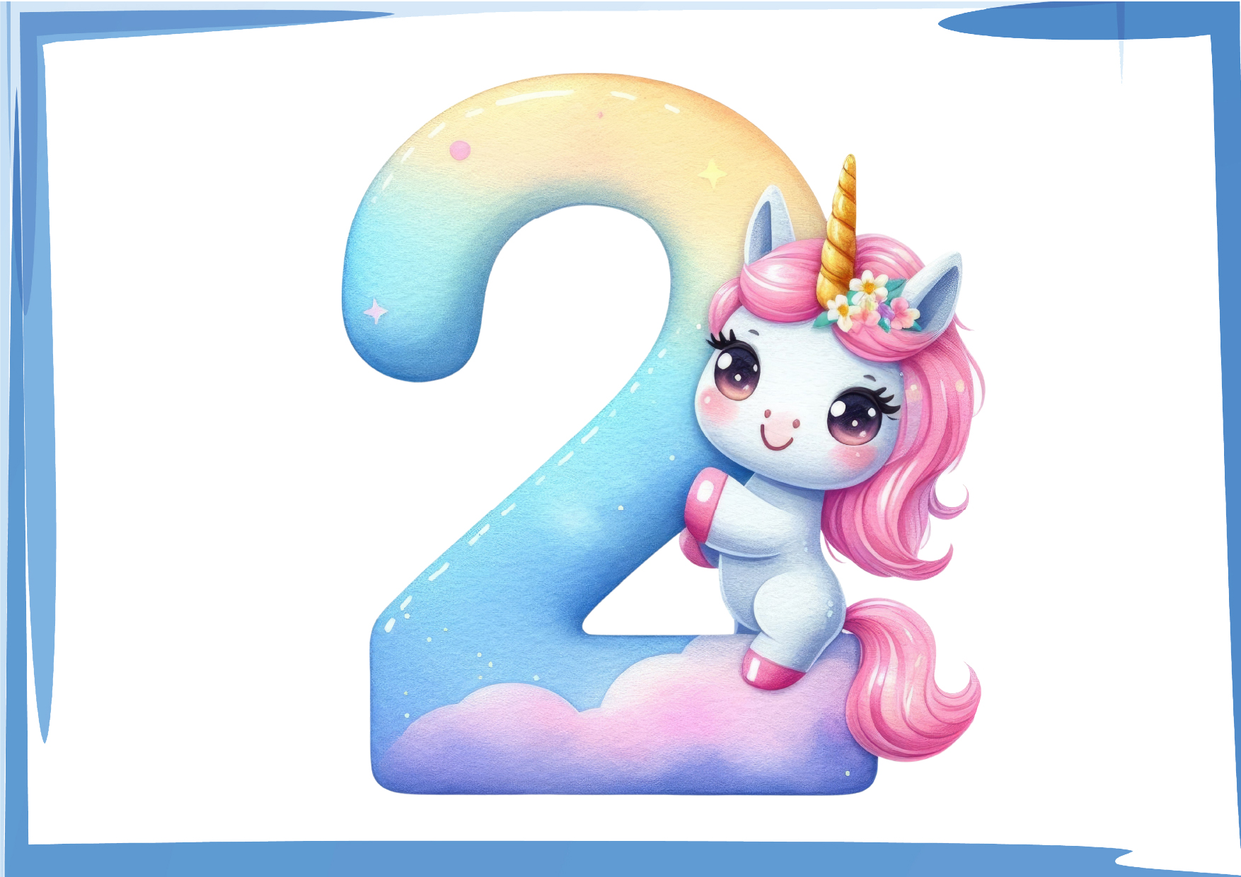 Kompletny zestaw 10 kart edukacyjnych (0-9) przedstawiających magiczne jednorożce połączone z nauką liczb w języku angielskim. Każda karta zawiera dużą, wyraźną cyfrę w pastelowej kolorystyce oraz uroczego jednorożca o tęczowej grzywie. Wysokiej jakości ilustracje utrzymane są w spójnej, przyjaznej dziecku estetyce, wykorzystującej delikatne przejścia między różem, błękitem i żółcią.