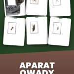 Dziecko wycina aparat z pierwszej strony. Pokazujesz kartkę ze zdjęciem owada, dziecko przykłada aparat do kartki i „robi zdjęcie" — klika palcem, mówi nazwę owada. Jeśli zna nazwę — gratulacje. Jeśli nie — mówisz mu, a ono powtarza. Typowa sesja: 20 owadów w 10 minut.