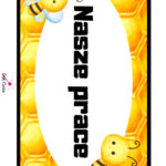 Jeśli masz mniej miejsca, układ można zwinąć w pionie: napis u góry, pod spodem dwie kolumny po sześć miesięcy, a pszczółki rozłożone wokół. Sprawdza się też wersja na drzwiach szatni: tylko napis grupowy plus dwie pszczółki dekoracyjne.
