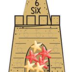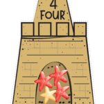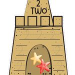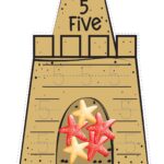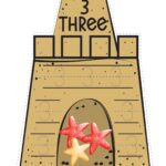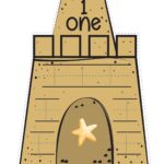 Letnie wycinanki dla dzieci do druku z liczbami 1-10 po angielsku. 10 zamków z piasku z rozgwiazdami, do wycinania, pisania po śladzie i naklejania na gazetkę. Wiek 3-8 lat.