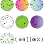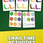 Druga warstwa zabawy to dopasowanie godziny analogowej do cyfrowej. Czternaście prostokątnych kart cyfrowych pokazuje czas w zapisie 12:00, 12:05, 01:00, 01:10, 02:15, 03:00, 03:20, 04:00, 04:30, 05:00, 05:35, 06:40, 07:45, 08:55. Dziecko czyta zegar analogowy na muszli, szuka tej samej godziny w wersji cyfrowej i kładzie obok ślimaka. Bez tej pary zadanie się nie zamyka — tworzy się moment skupienia, który u sześciolatków rzadko trwa dłużej niż dwie minuty bez konkretnego celu.