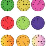Ślimak bez muszli to ślimak smutny — i właśnie ta historyjka rozkręca tę aktywność. Dzieci dostają dwanaście ślimaczków w żywych kolorach (czerwony, granatowy, zielony, pomarańczowy, różowy, fioletowy, żółty, turkus, brązowy, magenta i jeszcze kilka odcieni), z pustym okręgiem zamiast muszli. Na osobnych stronach czekają muszle-zegary: dziewięć analogowych z kolorowymi tarczami i wskazówkami pokazującymi konkretne godziny. Zadanie polega na tym, żeby wyciąć ślimaka, wyciąć właściwą muszlę-zegar i wkleić ją w okrągłe miejsce. Każdy ślimak dostaje tarczę z inną godziną, a cała kolonia pełza po stronie z różnym czasem.