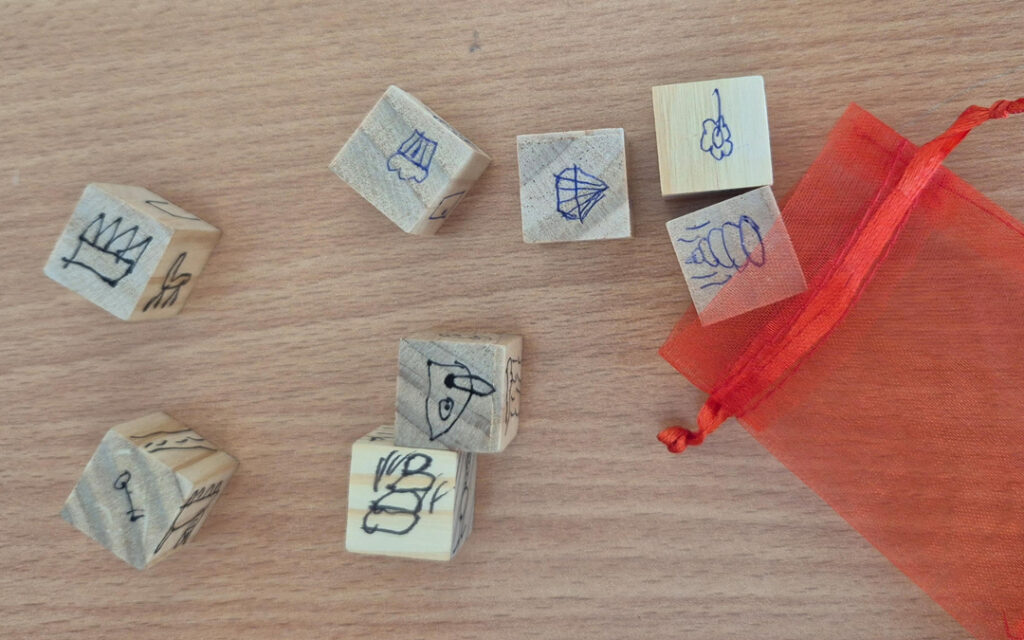 Każde dziecko otrzymało cztery drewniane kostki. Na każdej ścianie rysowały różne symbole, postacie, zwierzęta, przedmioty czy miejsca – wszystko to, co mogło stać się elementem opowieści. Zachęcałam uczniów do wyboru obrazków zgodnych z ich zainteresowaniami, co dodatkowo motywowało ich do pracy. Powstały wyjątkowe kostki – każda inna, każda odzwierciedlająca pomysłowość dzieci.